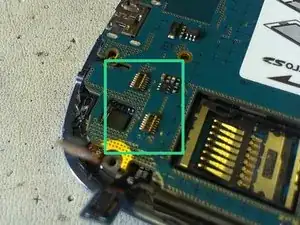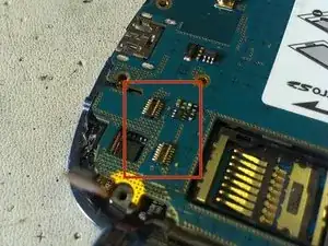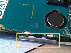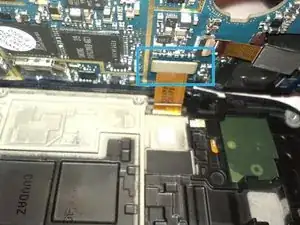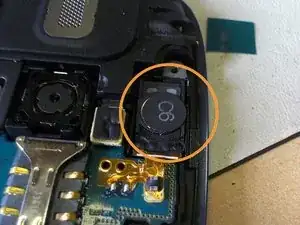 Здесь находится разговорный динамик. Он приклеен к передней панели, поэтому его нужно либо освободить, либо отсоединить два контактных узла на гибком кабеле.