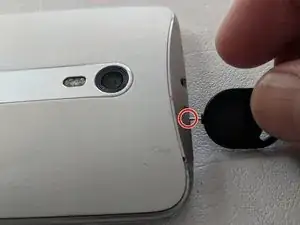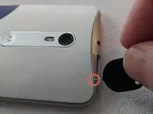 После длительного прогрева клей должен смягчиться. Возьмите тонкий пинцет для извлечения SIM-лотка и вставьте его в маленькое отверстие рядом с лотком на задней панели телефона.