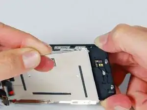 Сдвиньте ленточный кабель из разъёма и снимите сборку дисплея с iPhone.