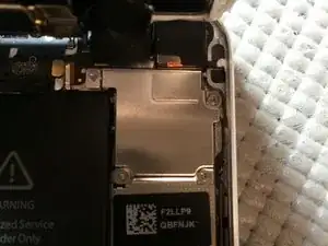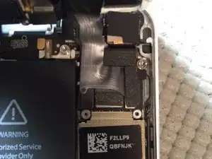 После использования лопатки или вакуумной присоски для поднятия экрана. Будьте осторожны, чтобы не поднимать экран полностью. Шлейф датчика Touch ID прикреплен рядом с кнопкой «Домой». Необходимо аккуратно снять маленькую металлическую скобу перед тем, как отсоединить разъем шлейфа.