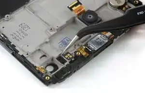 Если вы собираетесь продолжать и снимать узел материнской платы, после отключения фронтальной камеры её снимать не обязательно. Однако если вы не уверены, аккуратно удалите её пинцетом.