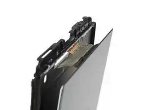 Лучший способ закрепить новый экран — использовать лист двустороннего клейкого скотча, вырезанный по размеру. Нанесите скотч на тыльную сторону экрана, затем аккуратно проденьте кабели дисплея и сенсорного экрана через рамку. Выровняйте экран и прижмите его на место.