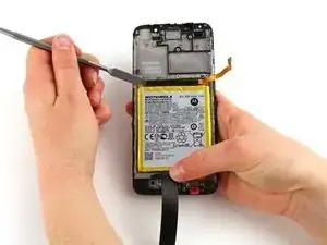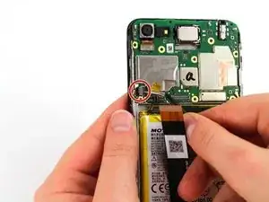 Используя пинцет с изогнутыми концами, отключите разъём, соединяющий дочернюю плату с аккумулятором, потянув металлический разъём перпендикулярно вверх относительно телефона.