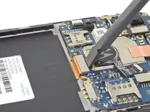Используйте плоский конец лопаточки, чтобы отсоединить гибкий кабель материнской платы, поднимая пресс-коннектор строго вверх.
