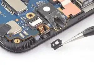 Используйте пинцет, чтобы снять наклейку, закрывающую винт под разъёмом для наушников.