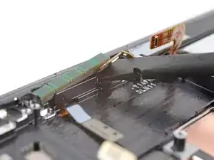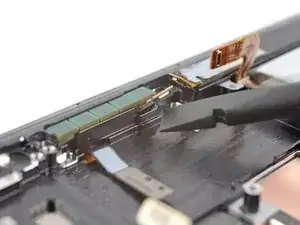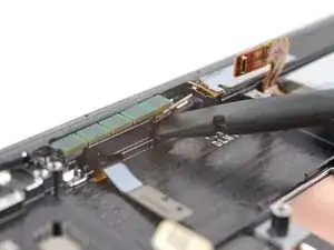 Используйте заострённый конец лопатки, чтобы поддеть и отсоединить прижимной разъём NFC-антенны от материнской платы.