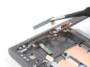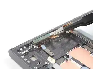 Используйте острый конец лопатки, чтобы поддеть и отсоединить левый контактный разъём 5G mmWave антенны.