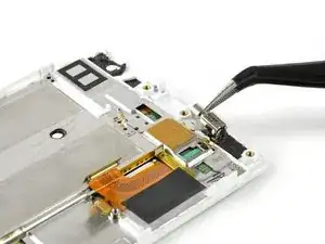 Удалите два винта Phillips #00, удерживающие кронштейны фронтальной камеры и разъемов дисплея/батареи.