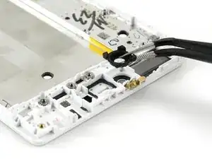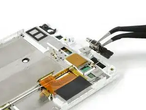 С помощью пинцета снимите кронштейн, закрывающий разъемы дисплея и батареи.
