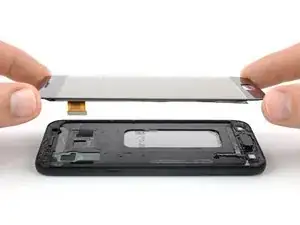 Ещё не открывайте телефон полностью. Шлейф дисплея всё ещё продет через среднюю рамку, и вы можете оторвать шлейфы кнопки «Домой» и навигационных кнопок.
