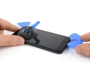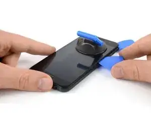 Поднимите присоску и вставьте лезвие для вскрытия под модуль дисплея.