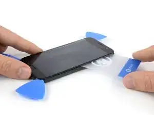 После разрезания клея по всем сторонам вставьте пластиковую карту под модуль дисплея, чтобы ослабить оставшийся клей позади него.