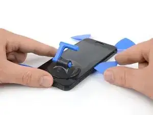 Вставьте лезвие для вскрытия с правой стороны телефона после того как разрежете клей по всем сторонам. Поверните его боком, пока не получится надежно захватить заднюю крышку.