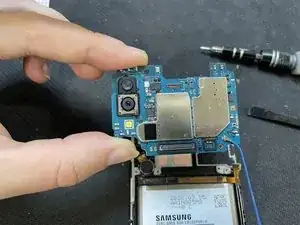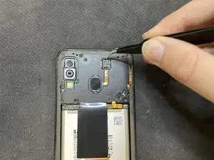 Далее необходимо снять датчик отпечатков с устройства. Для этого используйте пинцет или маленькую металлическую лопатку, аккуратно подденьте эту пластиковую деталь и выпрессуйте её.