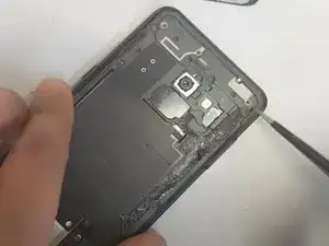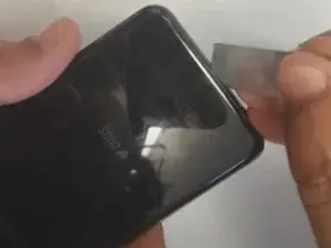 Осторожно вставьте пластиковую карту и открывающий инструмент между стеклом и рамкой, чтобы создать зазор. Аккуратно отделите заднее стекло от остального устройства.