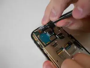 Вставьте пластиковый инструмент для вскрытия между материнской платой и передней панелью, чтобы демонтировать материнскую плату и шасси от передней панели телефона.