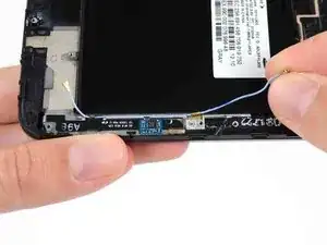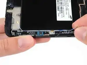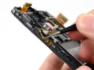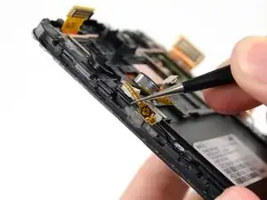 Используйте пинцет, чтобы отсоединить кнопку питания от клея, которым она прикреплена к сборке дисплея.