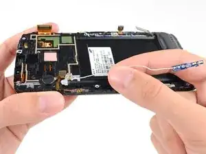 Вставьте кончик лопатки под вибромотор, чтобы освободить его от клея, которым он прикреплён к сборке дисплея.