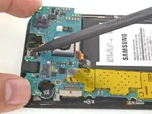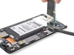 Используйте плоский конец лопатки, чтобы отключить шлейф аккумулятора от материнской платы.