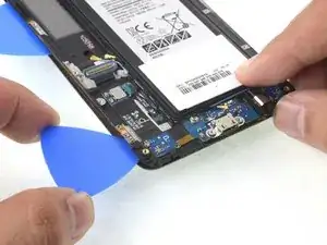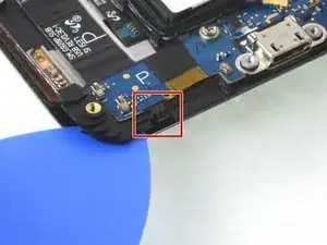 Остановитесь до того, как медиатор дойдёт до дочерней платы в нижней части телефона, так как под дочерней платой к дисплею приклеены деликатные ёмкостные кнопки, которые легко повредить.