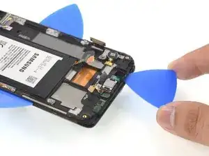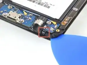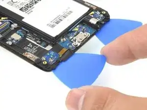 Просуньте медиатор вокруг угла дисплея, остановившись перед шлейфом кнопки «назад».