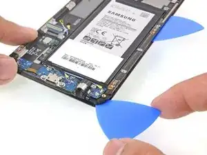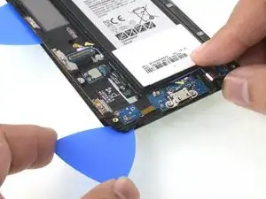 Используйте острый конец лопатки, чтобы отвести ленты батареи и сборки датчиков от краёв материнской платы.