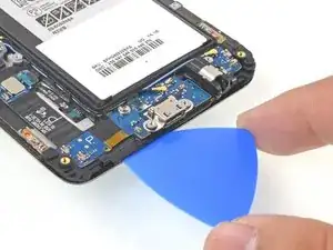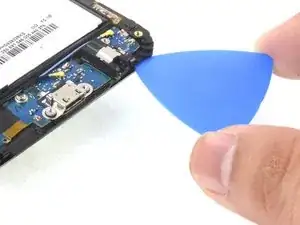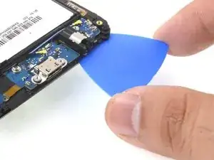 Проведите медиатор вниз по кромке дисплея, остановившись до того, как дойдёте до дочерней платы.
