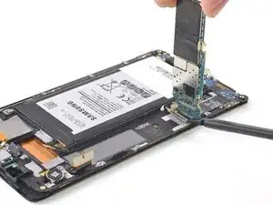 Убрав шлейфы батареи и сборки датчиков с пути, откиньте материнскую плату вверх и от дисплея, следя за тем, чтобы не создавать сильного натяжения на ленту дочерней платы.