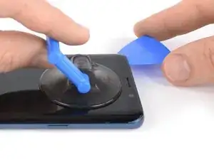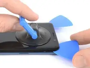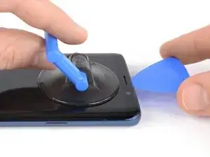 Вставьте инструмент для вскрытия в зазор и начните разрезать клей, продвигая инструмент к левому верхнему углу.