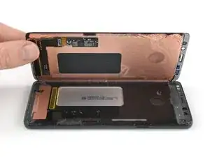 Пока не открывайте телефон полностью. Гибкий кабель считывателя отпечатков пальцев всё ещё подключён к материнской плате.