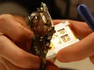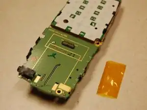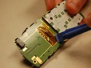 Используя пластиковую инструментуру, аккуратно снимите жёлтую плёнку, закрывающую разъём дисплея.