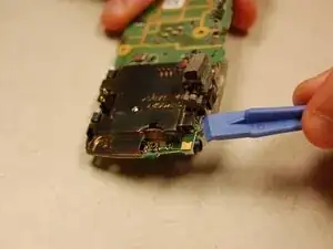 Используя пластиковую инструментуру, отведите белые защёлки дисплея от печатной платы, чтобы отсоединить дисплей.