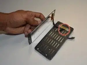 Когда экран полностью отсоединится от устройства, аккуратно протяните через отверстие ленточный кабель, ранее отключённый от материнской платы.