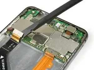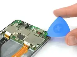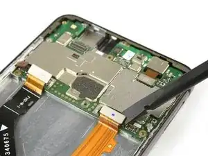 Плоским концом лопатки отсоедините шлейфы кнопок громкости и питания, дисплея и основной шлейф.