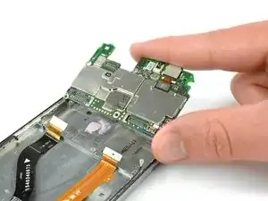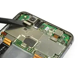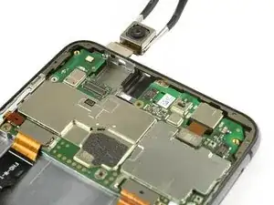 Фронтальная камера всё ещё прикреплена к плате. Не повредите её при извлечении платы.