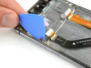 Используйте пластиковую лопатку, чтобы отрезать клей между шлейфом кнопок громкости и питания и средней рамкой.