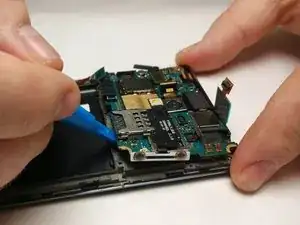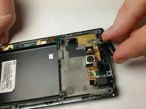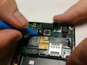 Снимите основную или тыльную камеру с помощью небольшого инструмента для поддевания, чтобы отодрать клей, затем поднимите камеру пинцетом.