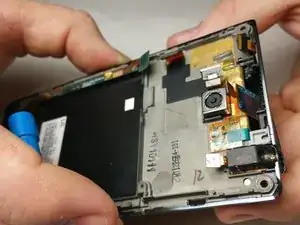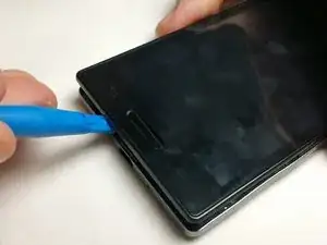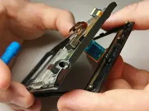 После снятия дигитайзера переверните телефон экраном вниз и снимите пластиковый кожух для переднего динамика. Он должен легко сниматься.