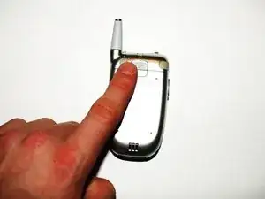 Чтобы извлечь аккумулятор, нажмите вверх пальцем на язычок, расположенный в верхней центральной части задней панели телефона.