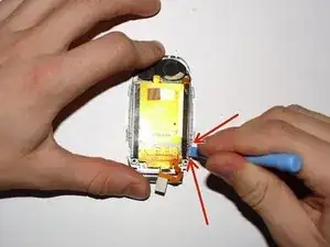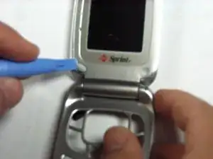 Осторожно вставьте пластиковый инструмент между шарниром и корпусом телефона.