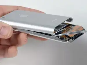 Вставьте инструмент для вскрытия iPod в зазор между крышкой антенны и передней рамкой. Клин инструмента должен быть направлен к крышке антенны. Просуньте инструмент вокруг угла и вверх, пока не дойдёте до металлической задней панели.