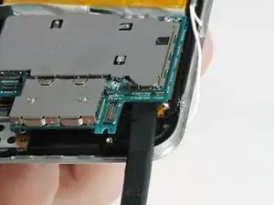 Поднимите плату логики слегка и подведите лопатку под плату логики, чтобы отсоединить шлейф дисплея.