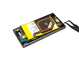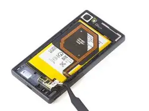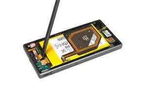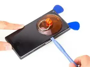 Клеевая лента под дисплейным модулем довольно прочная, поэтому используйте фен или тепловой пистолет, чтобы размягчить её в течение нескольких минут.