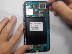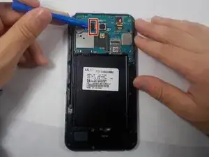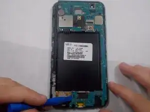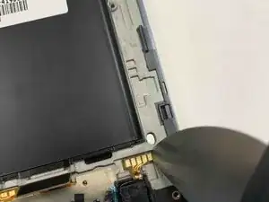 Вставьте инструмент для вскрытия в небольшой зазор под аккумулятором.