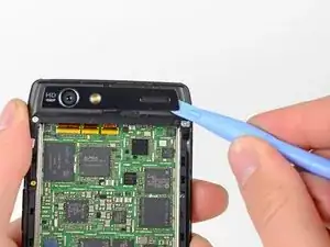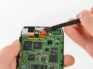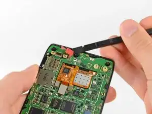 Используйте плоский конец лопатки, чтобы снять два красных силиконовых чехла микрофонов в верхней и нижней частях материнской платы.