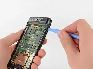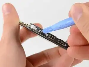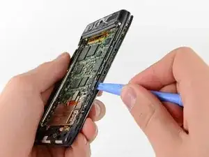 Вставьте пластиковый инструмент для вскрытия между задней крышкой и задним корпусом в нижнем левом краю задней крышки.