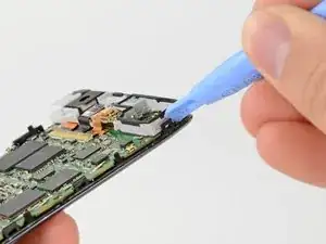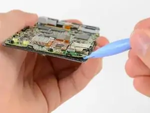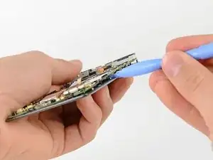 Подденьте края материнской платы от сборки дисплея пластиковым инструментом для вскрытия.