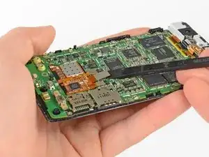 На плате имеется небольшой металлический экран, закрывающий разъёмы кабеля дисплейного модуля. Этот экран удерживается несколькими маленькими защёлками, которые крепятся к окружающим экранам EMI.