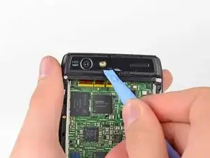 Аккуратно приподнимайте крышку камеры, одновременно проводя инструментом по верхнему краю, чтобы освободить её от клея.