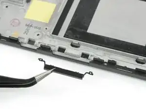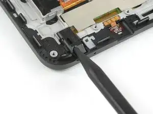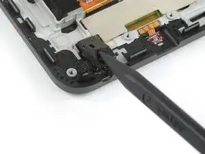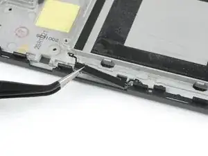 Используйте пластиковый медиатор, чтобы отжать пластиковые защёлки на длинном крае средней рамки и на нижнем крае.